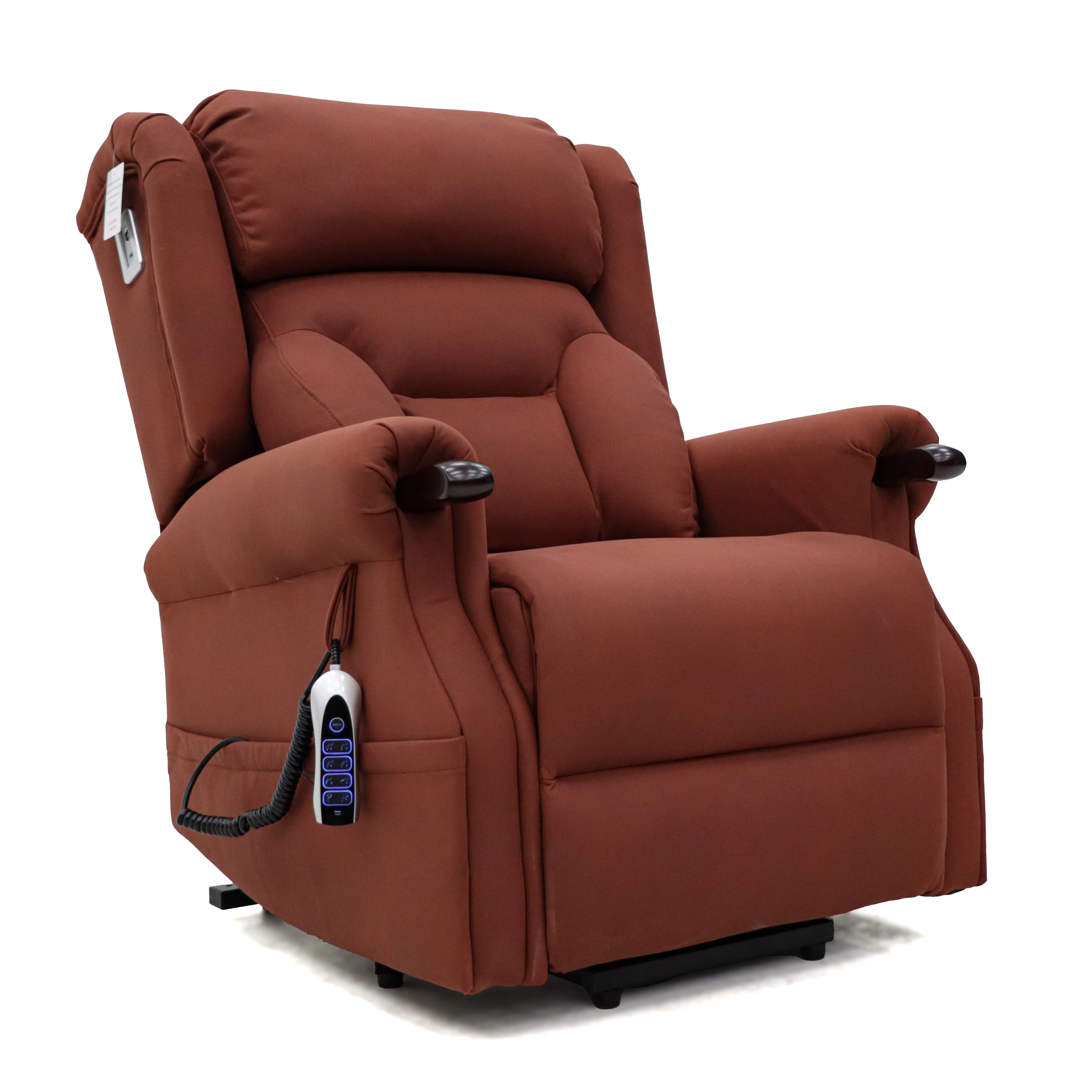 The dual-motor system allows independent control of the backrest and legrest, as well as smooth sit-to-stand motion, making it ideal for users who need assistive support. Extended timber knuckle arms offer extra grip when sitting or standing.